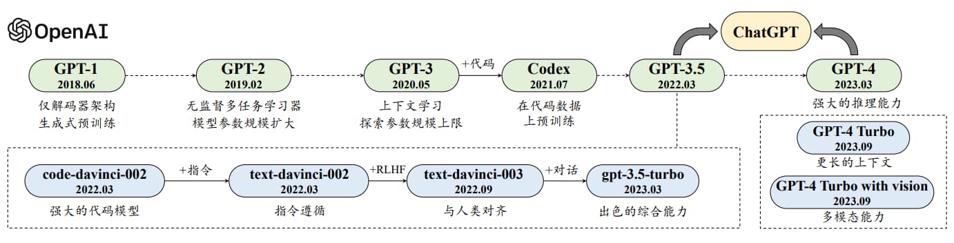 图 1-13 GPT 系列模型的技术发展历程 图 1-13 展示了 GPT 系列模型的技术演进示意图,其中实线表示两个模型之间的进化路径存在明确的公开证据,而虚线表示较弱的进化关系。
